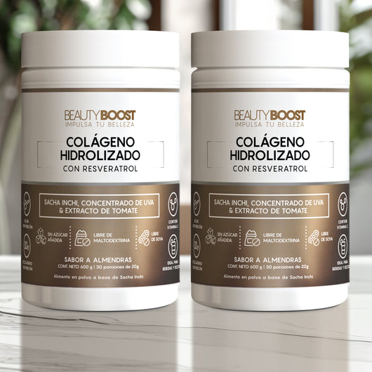 Además de colágeno hidrolizado, nuestra fórmula contiene sacha inchi, una semilla rica en proteína y omegas 3, 6 y 9. Está enriquecida con Resveratrol, un conocido antioxidante, Biotina, un componente conocido por sus beneficios. Además, esta fórmula contiene Vitamina D3, Vitamina C, Vitamina A y Vitaminas B1, B6 y B12.
