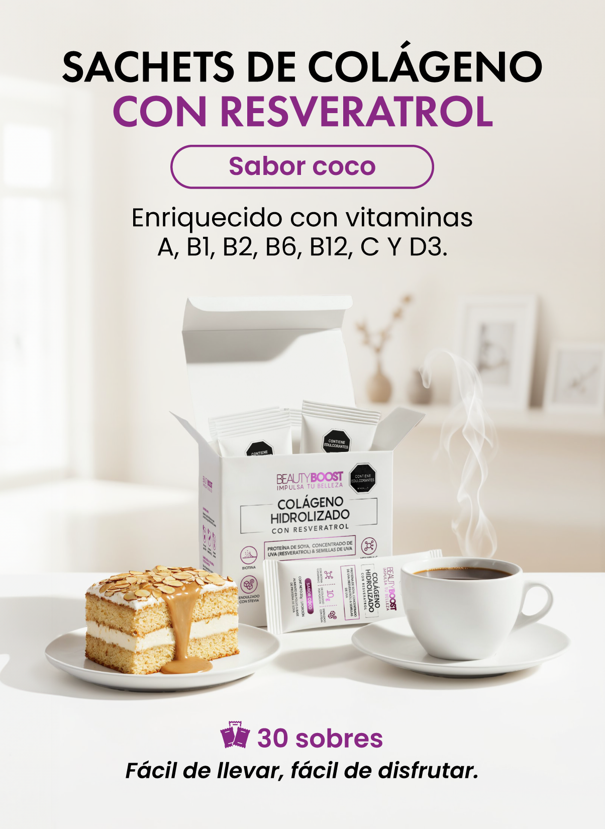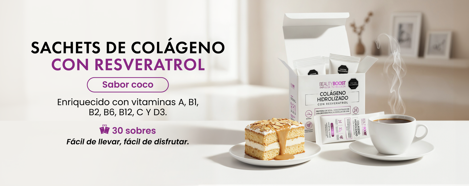 Sachets de Colágeno hidrolizado con resveratrol y biotina sabor coco, endulzado con estevia